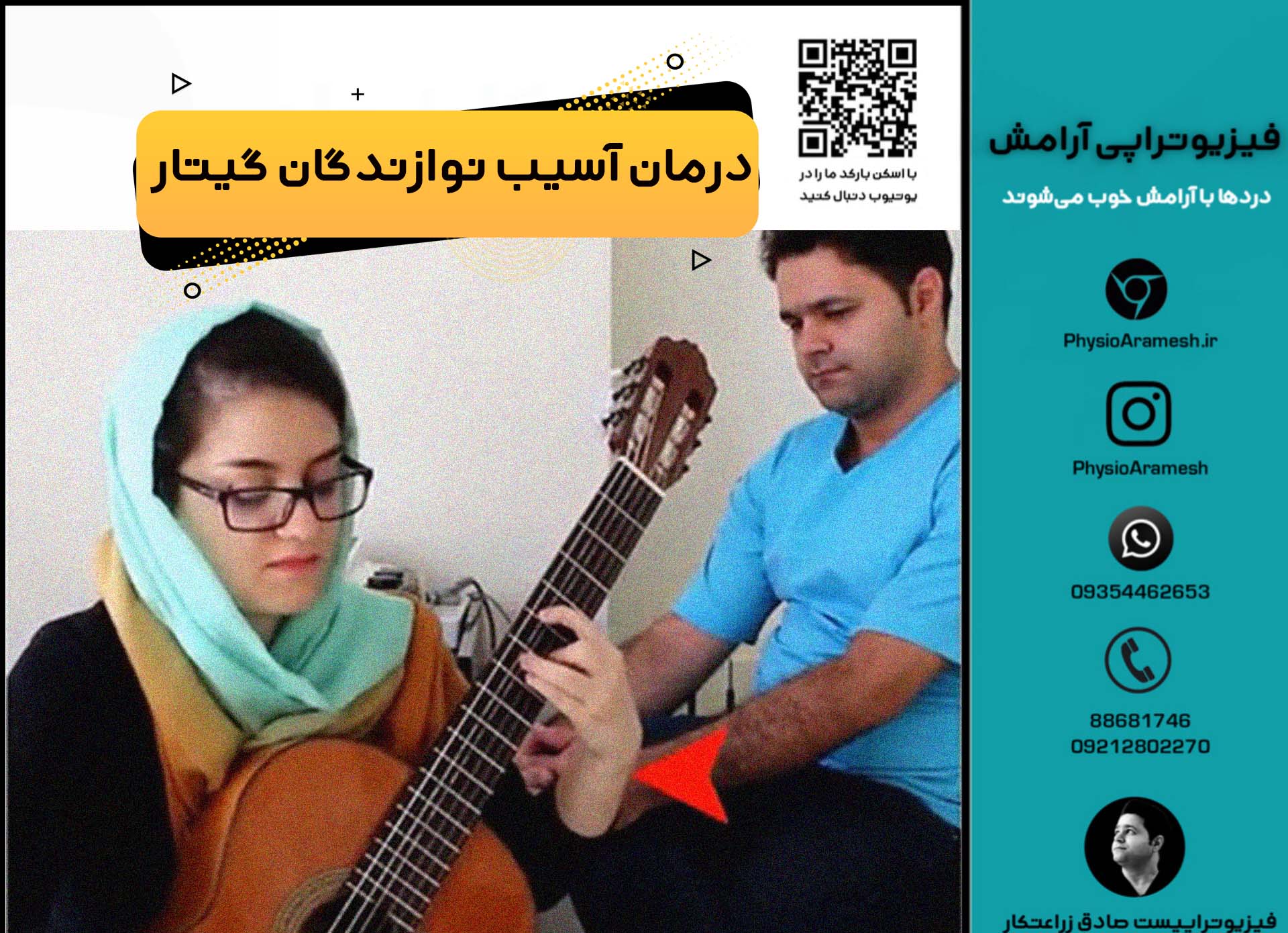Guitar playing involves repetitive movements and asymmetrical postures that can lead to musculoskeletal injuries in the wrist, shoulder, spine, pelvis, and lower back. These injuries often develop gradually and may affect performance quality if left untreated. Specialized physiotherapy, including biomechanical assessment, posture correction, and targeted exercises, plays a key role in preventing and treating guitar-related injuries. Such treatments are available at Aramesh Physiotherapy Clinic in Saadat Abad.